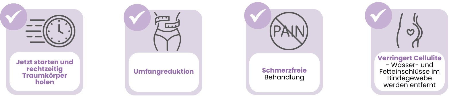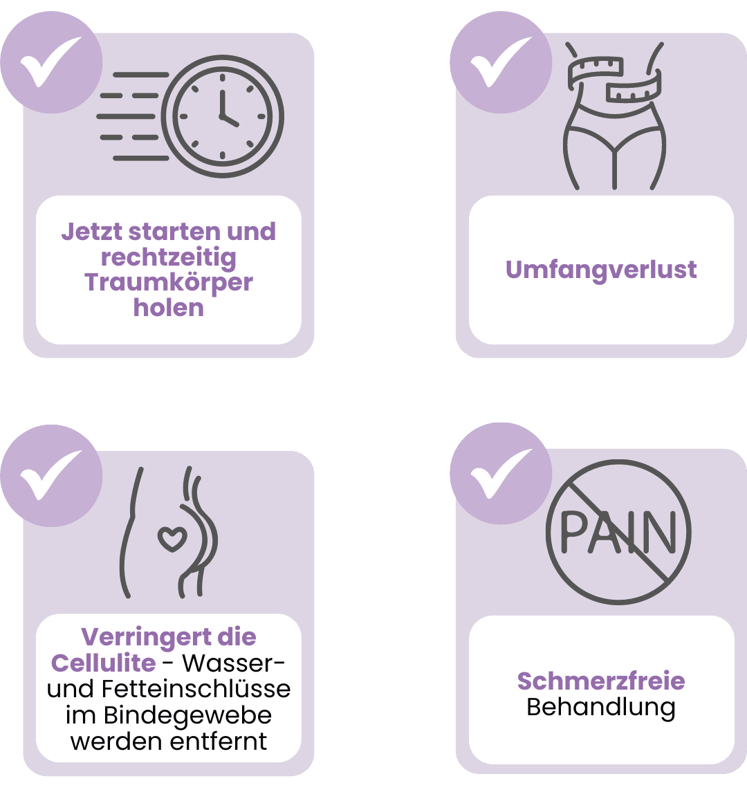 "In unserem Körper gibt es viele Fettzellen. Bei unserer Methode bearbeiten wir diese Fettzellen mit Strom, Ultraschall und Wärme. Mit diesen 7 Schritten kommst Du an Dein Ziel!"